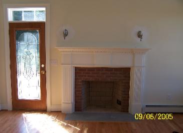 LOOKING AT REAR DOOR AND FIRE PLACE